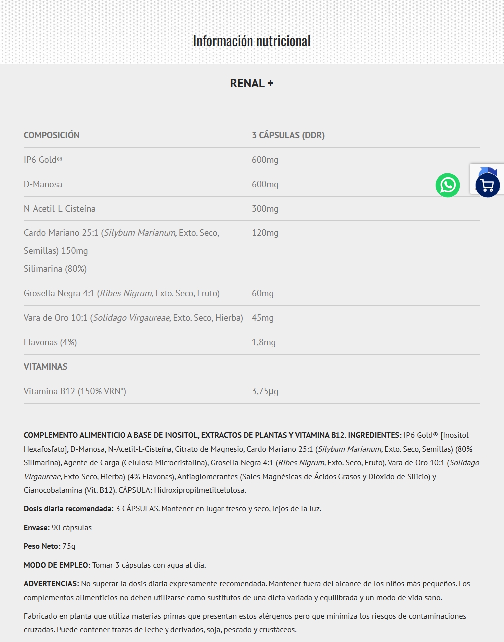 Renal+. Un detox depurativo que ayuda a mantener la salud renal y al correcto funcionamiento de los riñones, concCardo mariano, vitamina B12 e IP6 – 90 Cápsulas.