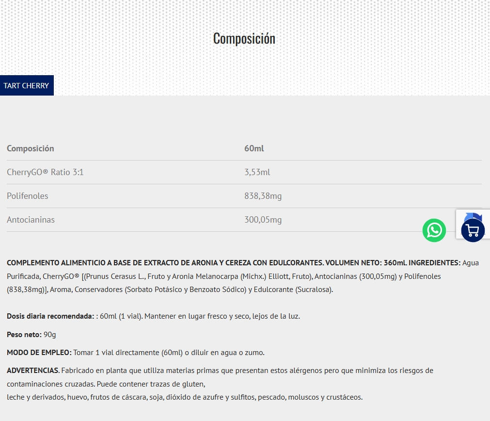 COMPOSICIÓN: Tiene una concentración única en el mercado con 300mg de antocianinas y más de 800mg de polifenoles. Certificado por Informed Sport